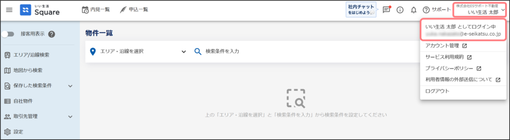1. 「内見/申込管理サービス」右上のアカウント名から「ログアウト」をクリックします。