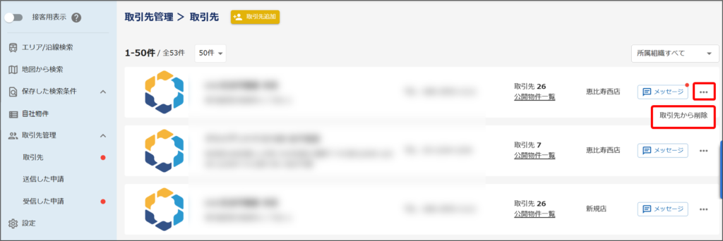 1.取引先を削除する場合は、対象の取引先の「…」項目をクリックし、