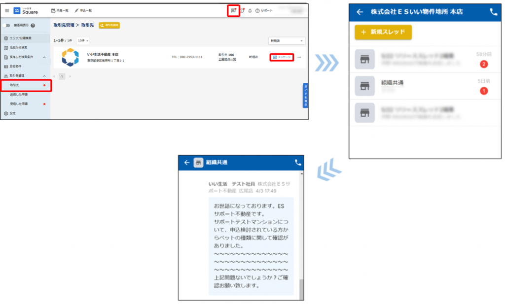 メッセージを受信した不動産会社は、上部のメッセージアイコンか取引先から「メッセージ」を開き、