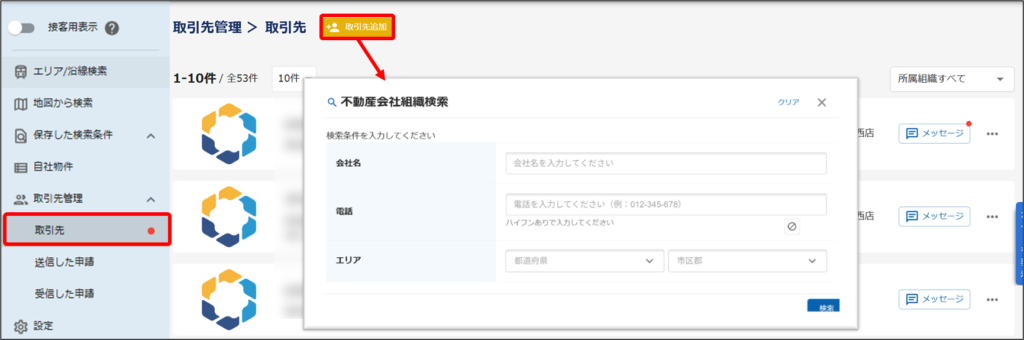 いい生活Squareを利用している不動産会社を検索し、取引先追加の申請、承認されると