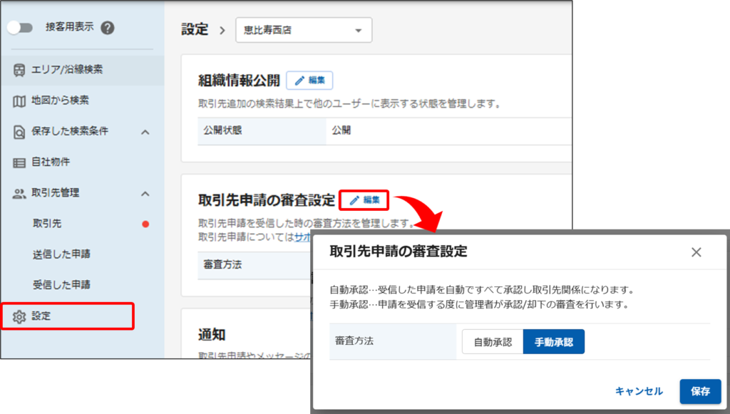 1.取引先申請の審査方法は手動承認と自動承認から選択できます。