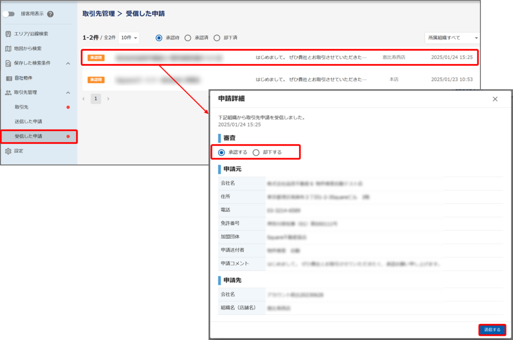 ※取引先管理画面で送信・受理した申請を確認可能です。