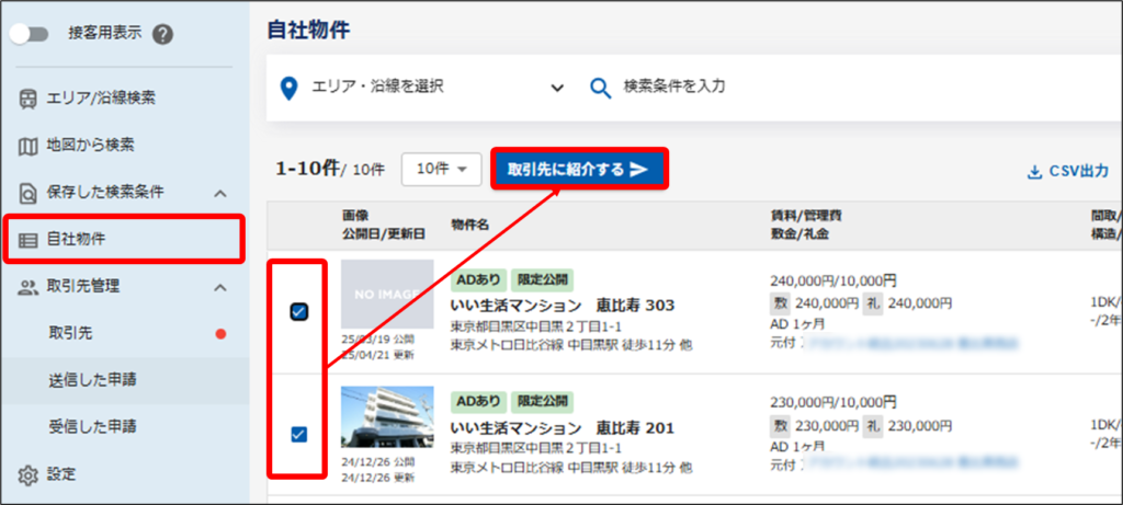 2.紹介したい自社物件にチェックを入れ、「取引先に紹介する」をクリックします