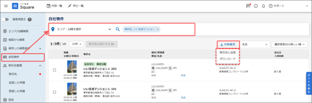[自社物件]>[CSV出力]>「取引先に送信」 より、空室一覧の送信をご依頼ください。